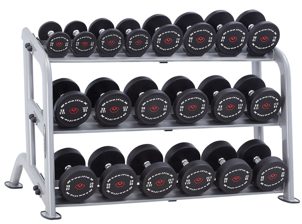 The three-tier, space-efficient design for rack NDR3 accommodates dumbbells from 2.5 kg to 25kg. Small brackets on every one of the shelves allow convenient take up and put down, also help to recognize the required weight immediately.