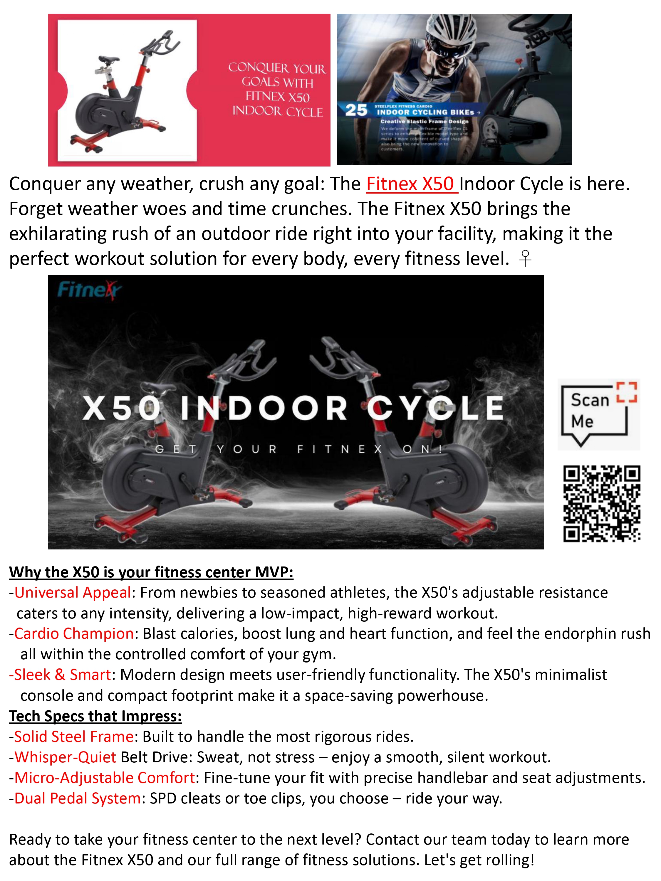 Embark on an immersive open-air ride adventure with the Fitnex X50 indoor cycle at your preferred facility, igniting your passion for fitness without any interruptions from unpredictable weather or time constraints. Connect with our staff today to explore additional benefits of the X50 and triumph over your workout goals!